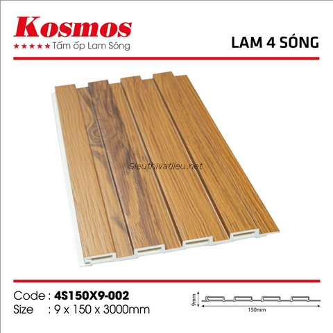 Mã số: Kosmos 4S150x9-002 Kiểu lam sóng: Lam nhựa 4 sóng thấp Xuất xứ : Trung Quốc Quy cách (Dài x Rộng x Dày): 3000 x 150 x 9 mm Kiểu vân gỗ: Lam nhựa 4 sóng, lam nhựa vân gỗ màu vàng Ứng dụng: Ốp vách lam sóng, ốp lamri lam sóng, ốp tường lam sóng, ốp trần lam sóng... trong nhà hoặc những nơi ít chịu ảnh hưởng trực tiếp nắng, mưa Kho hàng: HCM