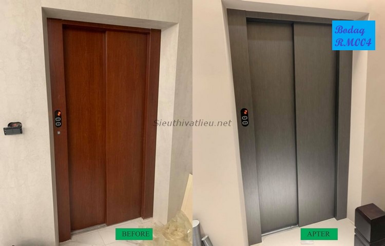 (Film nội thất vân kim loại xước màu bạc Bodaq RM004 dán cửa thang máy nhà phố)