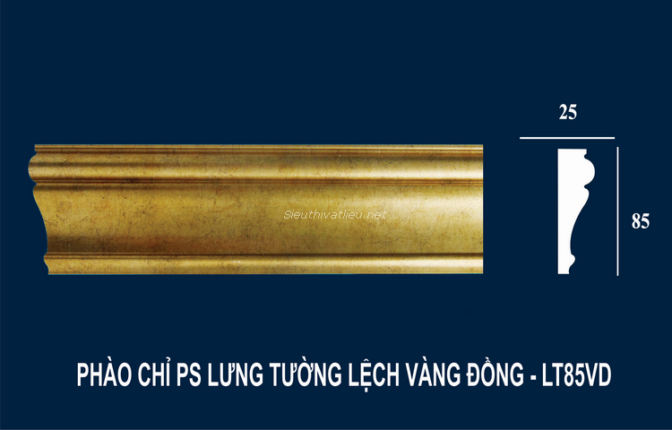 Tên sản phẩm: Phào chỉ PS lưng tường lệch vàng đồng LT85VD Xuất xứ : Việt Nam theo công nghệ Hàn Quốc Quy cách chung: Bản rộng 8.5 cm, dày 2.5cm Dài 3000mm / Thanh Ứng dụng: Phào chỉ PS lưng tường vàng đồng ốp khung trang trí. Phào chỉ PS lưng tường vàng đồng ốp vách trang trí. Phào chỉ PS lưng tường vàng đồng dùng cho tấm đá hoa cương pvc vân đá. Phào chỉ PS lưng tường vàng đồng để ốp các chỉ khung tranh trang trí trên tường, trần, giả đá, phòng Karaoke, nhà hàng, biệt thự Màu sắc: Phào chỉ PS lưng tường màu vàng đồng, màu vàng giả cổ