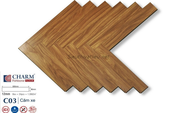 Mã số: Charm C03 Xuất xứ : Trung Quốc Quy cách (Dài x Rộng x Dày): 606 x 96 x 12 mm Đóng gói: 24 Thanh / 1.3962 m2 / Hộp Độ cứng: AC4 Kiểu lát sàn: Kiểu xương cá (Fishbone, Herringbone) Kiểu vân gỗ: Vân gỗ căm xe, màu nâu
