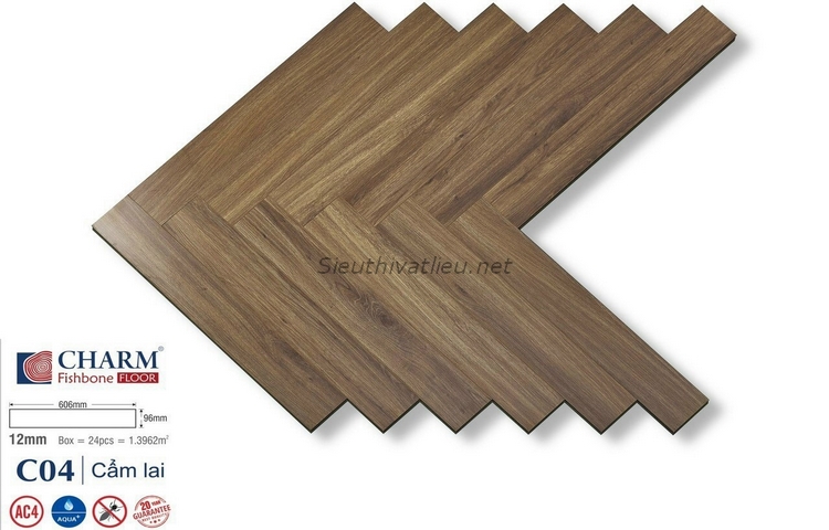 Mã số: Charm C04 Xuất xứ : Trung Quốc Quy cách (Dài x Rộng x Dày): 606 x 96 x 12 mm Đóng gói: 24 Thanh / 1.3962 m2 / Hộp Độ cứng: AC4 Kiểu lát sàn: Kiểu ghép xương cá (Fishbone, Herringbone) Kiểu vân gỗ: Vân gỗ cẩm lai, màu nâu