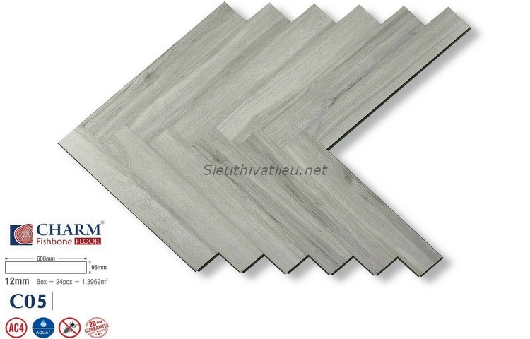 Mã số: Charm C05 Xuất xứ : Trung Quốc Quy cách (Dài x Rộng x Dày): 606 x 96 x 12 mm Đóng gói: 24 Thanh / 1.3962 m2 / Hộp Độ cứng: AC4 Kiểu lát sàn: Kiểu ghép xương cá (Fishbone, Herringbone) Kiểu vân gỗ: Vân gỗ màu xám trắng