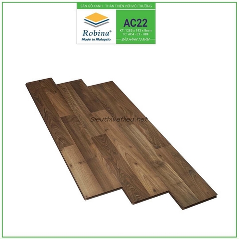 Mã số: Robina AC22 Xuất xứ: Malaysia Quy cách (Dài x Rộng x Dày): 1283 x 193 x 8 mm Đóng gói: 8 Thanh / 1.98 m2 / Hộp Độ cứng: AC4 Bề mặt: Bề mặt mờ Kiểu vân gỗ: Vân gỗ ghép, Màu Nâu Kho hàng: HCM