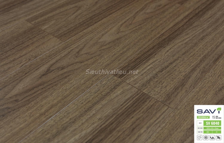 Mã số: SV 6040 Thương hiệu sàn gỗ: SAVI Xuất xứ : Việt Nam Quy cách (Dài x Rộng x Dày): 1223 x 147 x 12 mm Đóng gói: 12 Thanh / 2.157 m2 / Hộp Cốt gỗ: Cốt gỗ (lõi) MDF Độ cứng: AC3 Bề mặt: Bề mặt mờ, bản lớn Kiểu vân gỗ: Sàn gỗ công nghiệp vân gỗ Sồi (Oak), màu Xám
