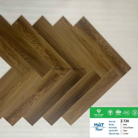 Mã số: MAT Z-720 Xuất xứ: Việt Nam Độ dày: 4 mm Quy cách tấm (Dài x Rộng x Dày): 615 x 123 x 4.2 mm Lớp lót: Có lớp lót Ixpe dưới đáy tấm sàn nhựa MAT tạo sự cân bằng cho tấm sàn nhựa nên không cần phải trải xốp trước khi thi công lắp đặt sàn nhựa MAT Cách thi công: Sàn nhựa hèm khóa ghéo kiểu lát xương cá (Fishbone, Herringbone) Đóng gói: 16 Tấm / 1.21 m2 / Hộp Kiểu vân: Sàn nhựa vân gỗ Sồi (Oak), màu Nâu Kho hàng: HCM & HN