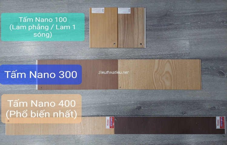 Tấm nhựa ốp tường Nano thường có 2 loại chiều rộng (Khổ rộng) là 300mm (thường gọi là tấm Nano 300) hoặc phổ biến hơn cả là khổ rộng 400mm (Tấm Nano 400), chiều dày tấm ốp tường Nano dao động từ 6mm đến 9mm, chiều dài phổ biến là 2,9 m hoặc 3 m để tiện cho việc vận chuyển và thi công tấm Nano.
