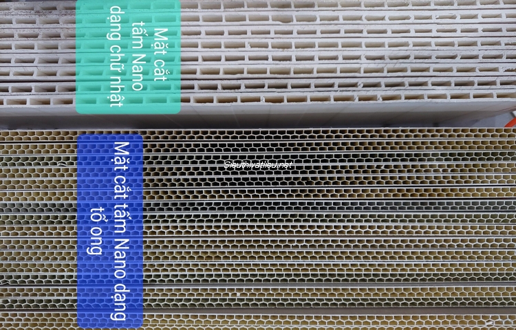 3.2 Mặt cắt phôi tấm nhựa Nano có 2 hình dạng phổ biến là dạng chữ nhật (hay hình vuông) và ít phổ biến hơn là dạng tổ ong mà nguyên nhân là do sử dụng các loại khuôn làm nhựa khác nhau. Tuy vậy cả 2 mặt cắt này đều giúp tấm nhựa Nano cứng hơn và cách âm cách nhiệt tốt hơn do có các lỗ trống trong thân tấm, đây là một trong những đặc điểm mà tấm nhựa ốp tường Nano vượt trội hơn các loại tấm nhựa ốp tường khác như tấm pvc nhựa giả đá